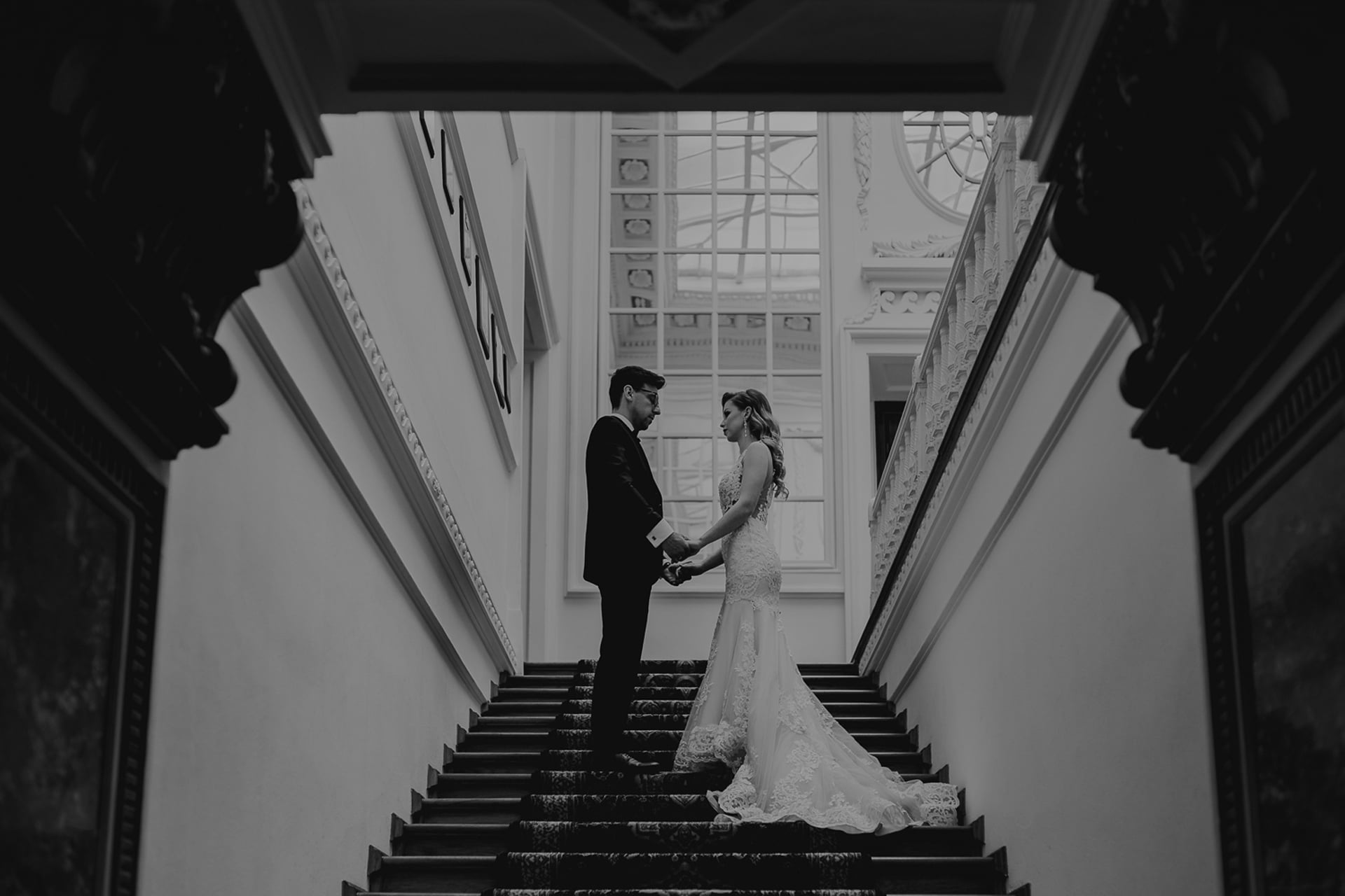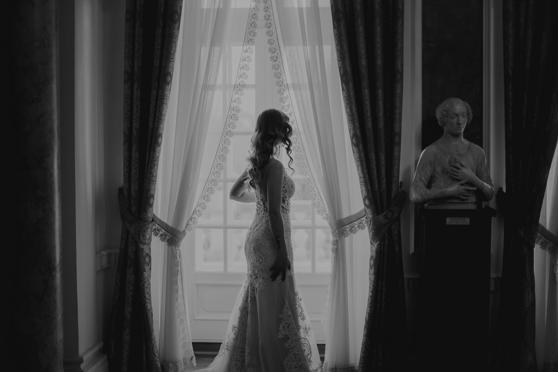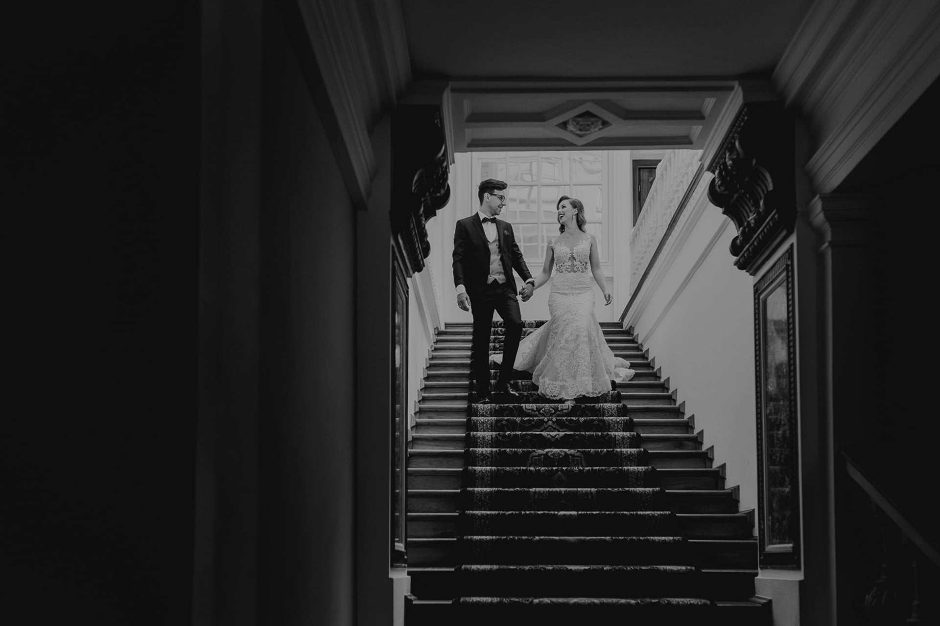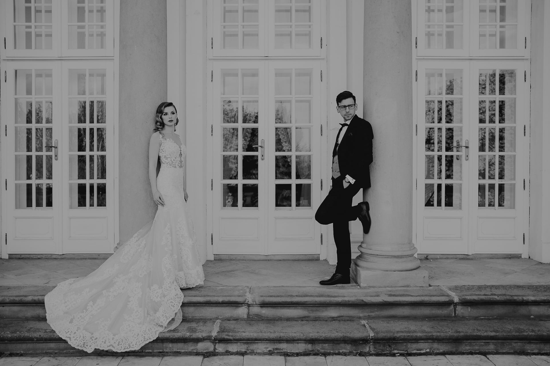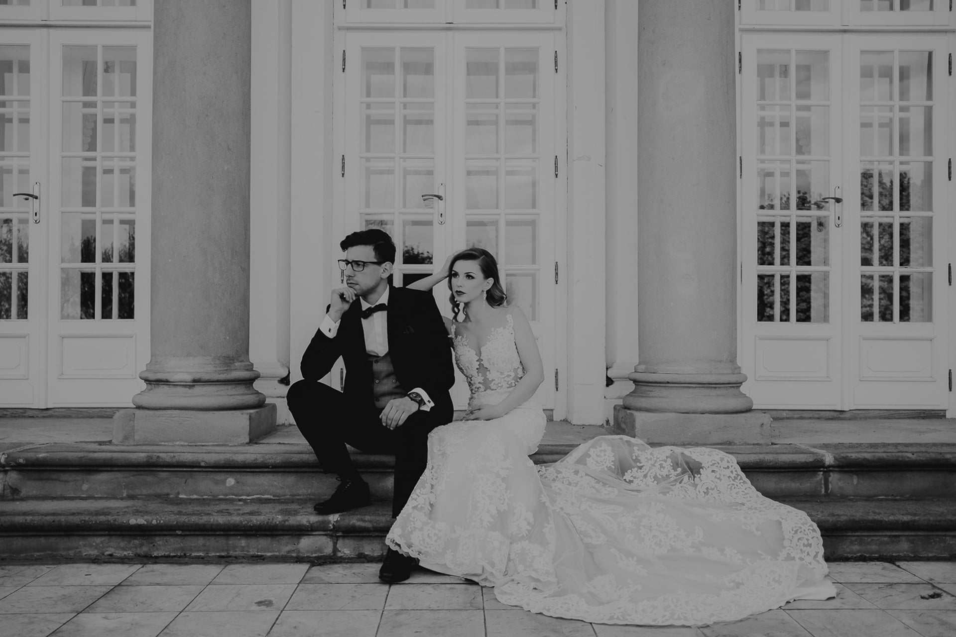Ukończenie budowy pałacu datuje się na XV wiek. Początkowo był to szlachecki dwór, ale dziś rezydencja służy przede wszystkim jako centrum konferencyjne i hotel. Śmiało można tu zorganizować również Pałac Radziwiłłów Wesele, zarówno w formie samego przyjęcia weselnego, jak i ślubu plenerowego. Jak widać na zdjęciach, lokacja ta wręcz obfituje w miejsca stworzone do robienia pięknych zdjęć. Nasza para młoda prezentuje się niezwykle elegancko na fotografiach robionych na dworze, z widokiem na pałac, jak i tych w środku, w jego urzekających wnętrzach. Ciekawie udało się wykorzystać również schody, które pozwoliły ukazać wszystkie detale sukni panny młodej.