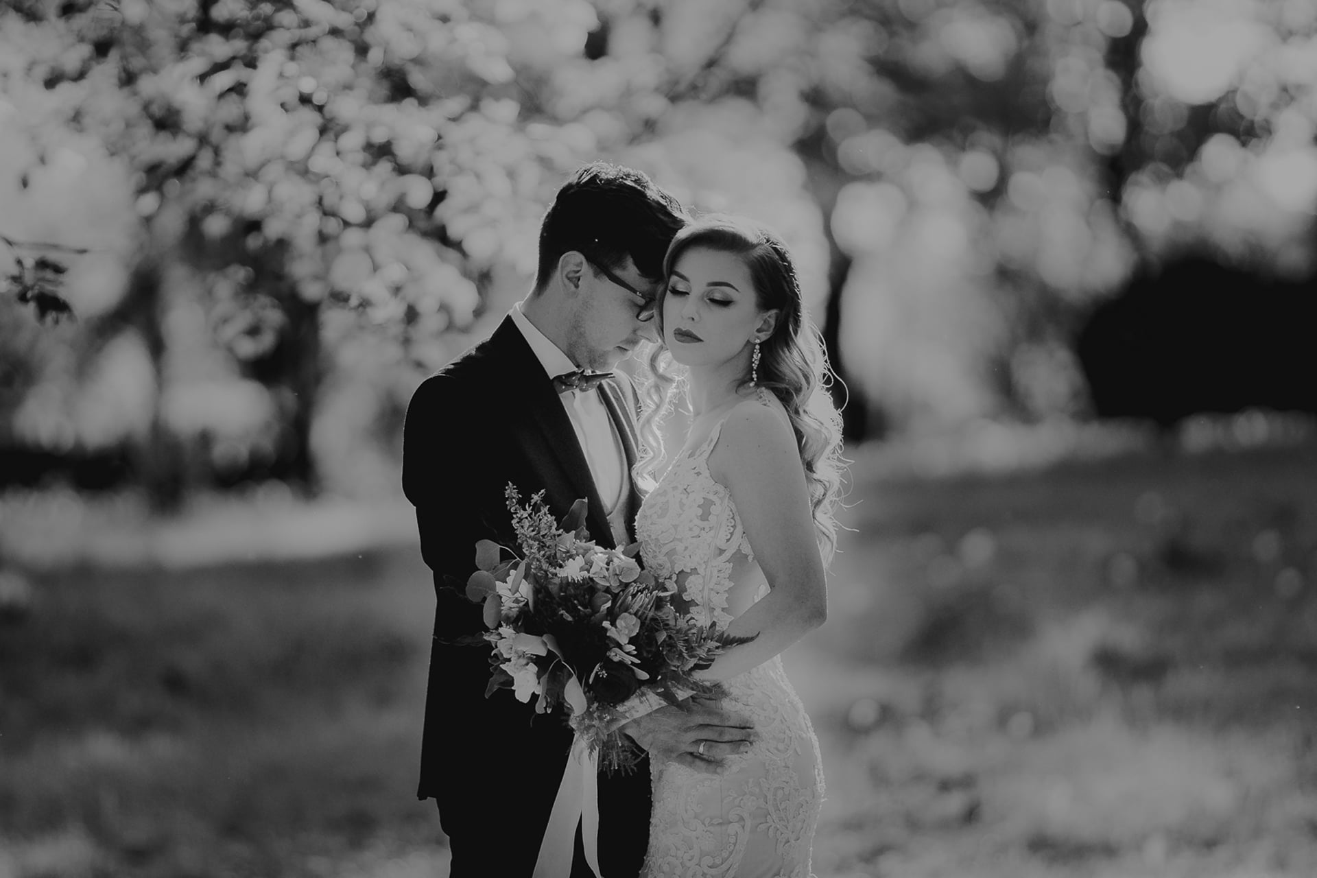 Jak pewnie zauważyliście Paulina i Marcin są bardzo romantyczną i cudowną parą. Dzięki ich otwartości i wielkiej miłości, która ich łączy mogły powstać niezwykłe fotografie ślubne. Las sam w sobie jest miejscem przepełnionym tajemniczością i magią, która powoduje, że dwie istoty wpatrzone w siebie, pośród drzew wyglądają jak zaczarowane. Sesja ślubna w lesie, nie jest łatwym zadaniem dla fotografa i kamerzysty, ponieważ wymaga zupełnie innego spojrzenia na temat ślubny. Paulina i Marcin byli świetnie przygotowani do swojej sesji zdjęciowej. Zadbali o detale takie jak kwiaty czy tabliczki mąż żona. Genialnie prezentuje się również przepiękny wianek ślubny. Nie można zapomnieć o tym, że nasza zakochana para jest wręcz stworzona do pozowania przed obiektywem.