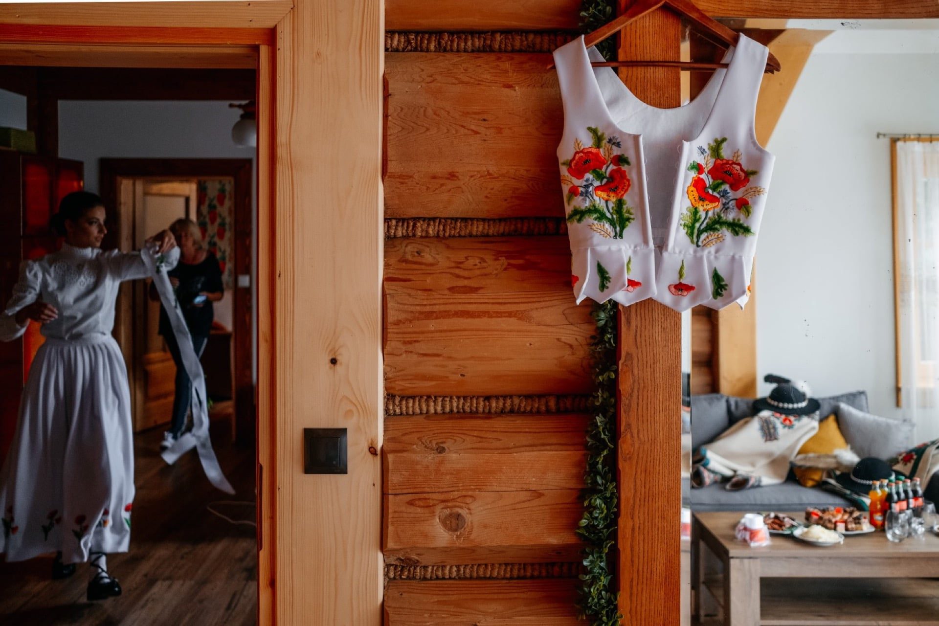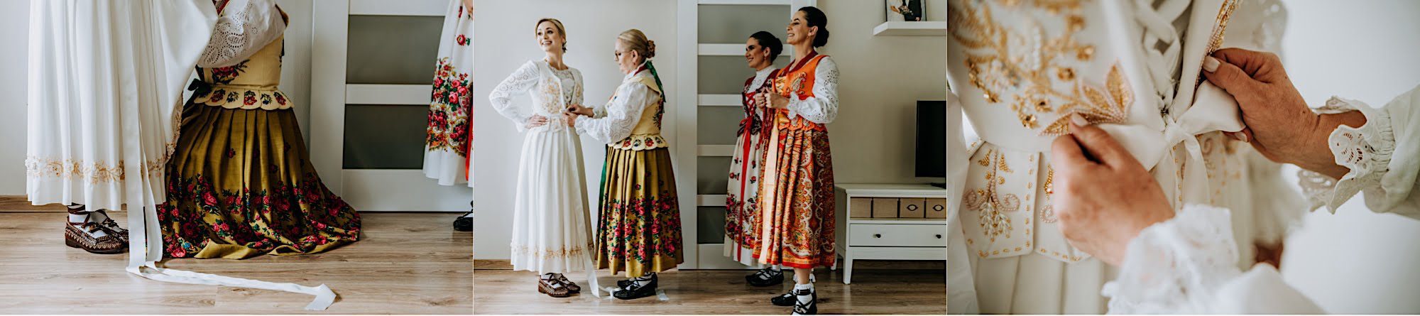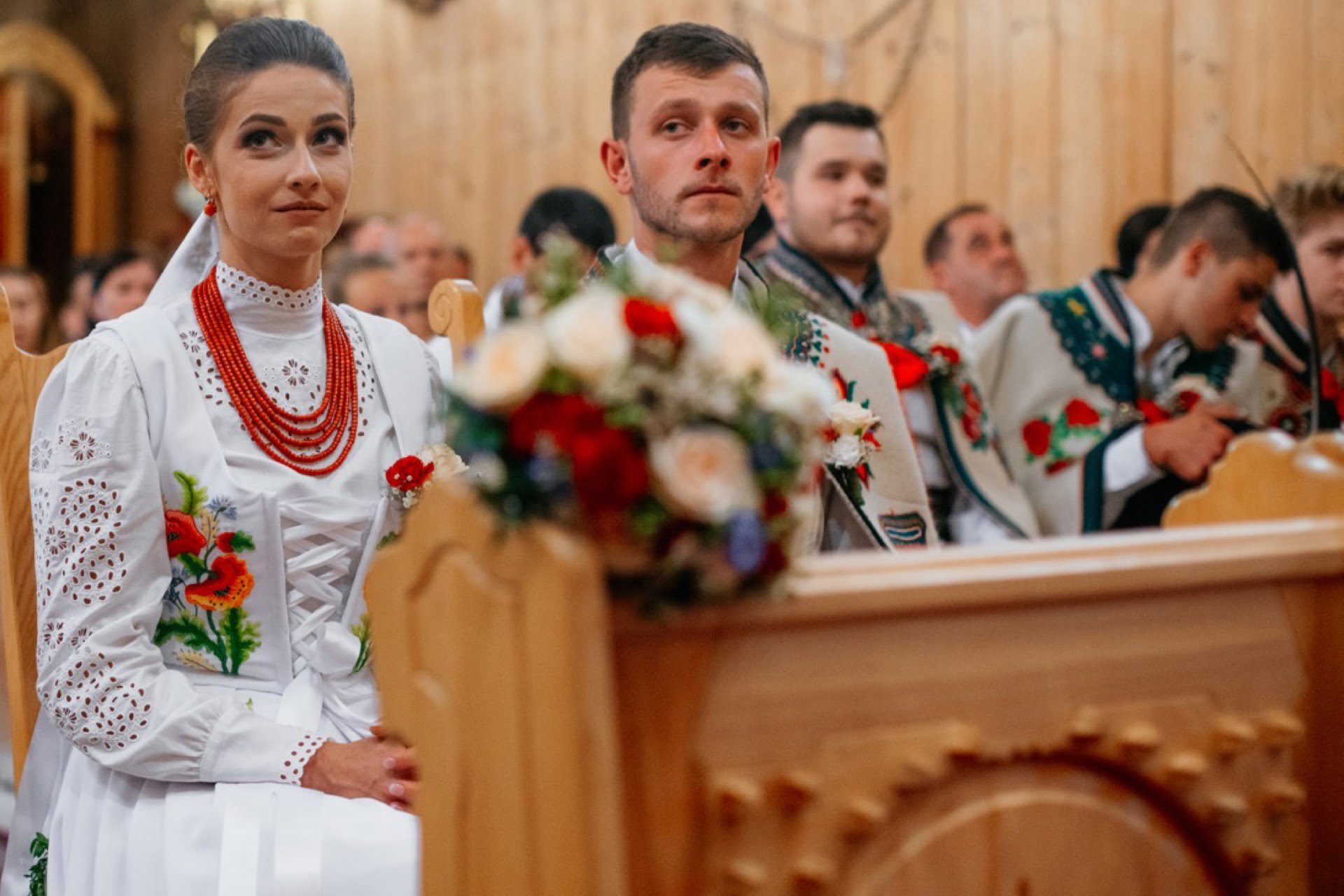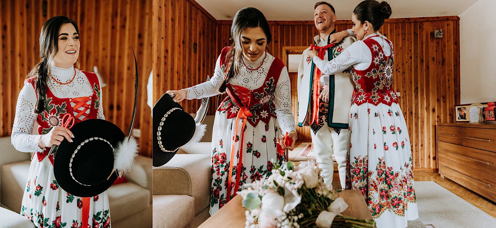 Suknia panny młodej składa się z kilku elementów. Są to między innymi koszula z haftem, aksamitna kamizelka i kilkuwarstwowa spódnica z koronkami, ale nie mniej istotne są same dodatki, czyli prawdziwe skórzane kierpce i czerwone korale. Co zakłada na siebie pan młody? Jest to również haftowana koszula oraz portki, czyli specjalne regionalne spodnie góralskie, a także bogato zdobiona peleryna. Nie pozostaje mi nic innego, jak życzyć im równie pięknego i kolorowego życia na nowej drodze.