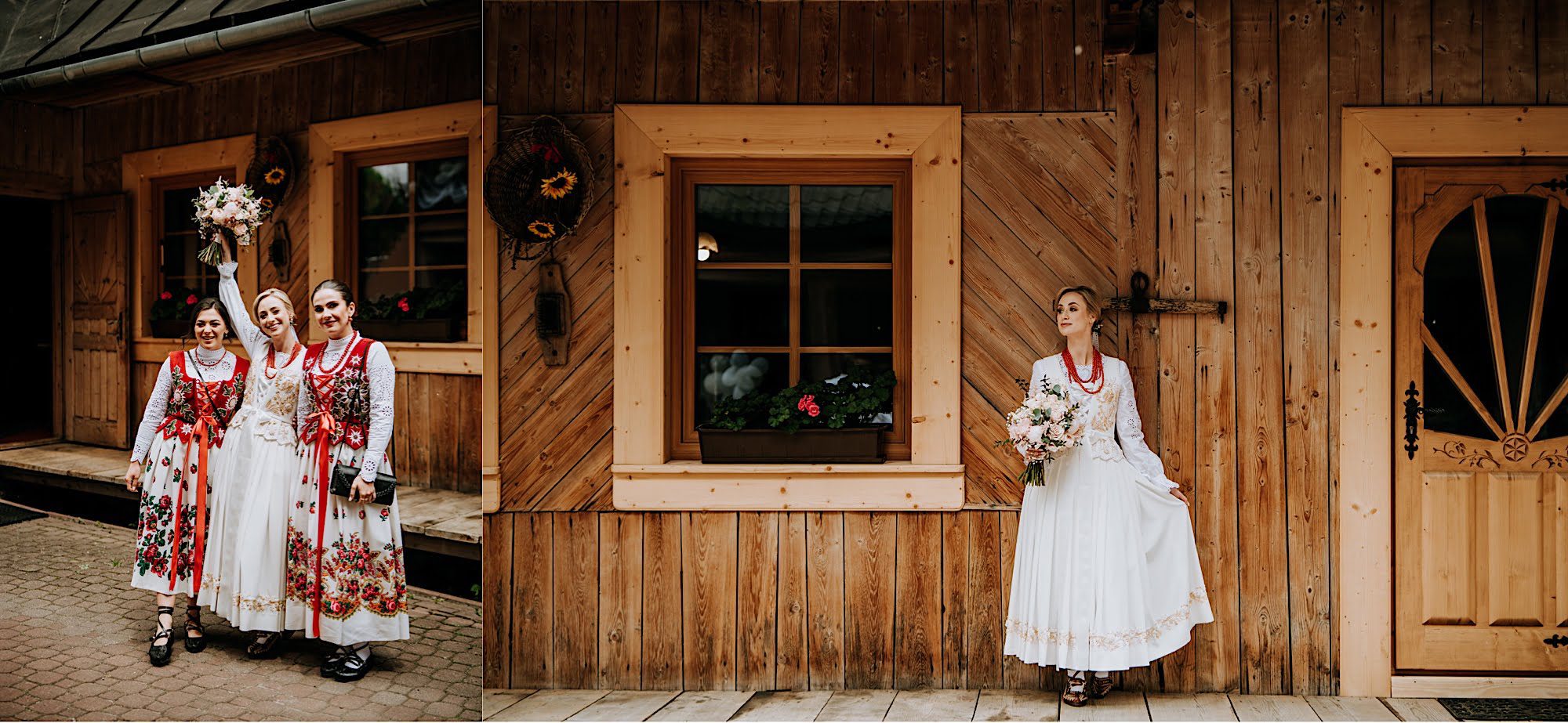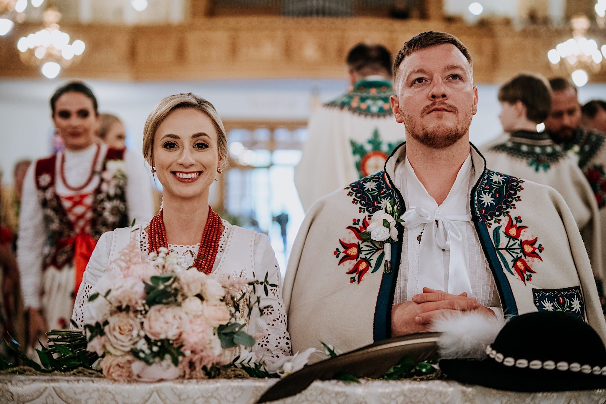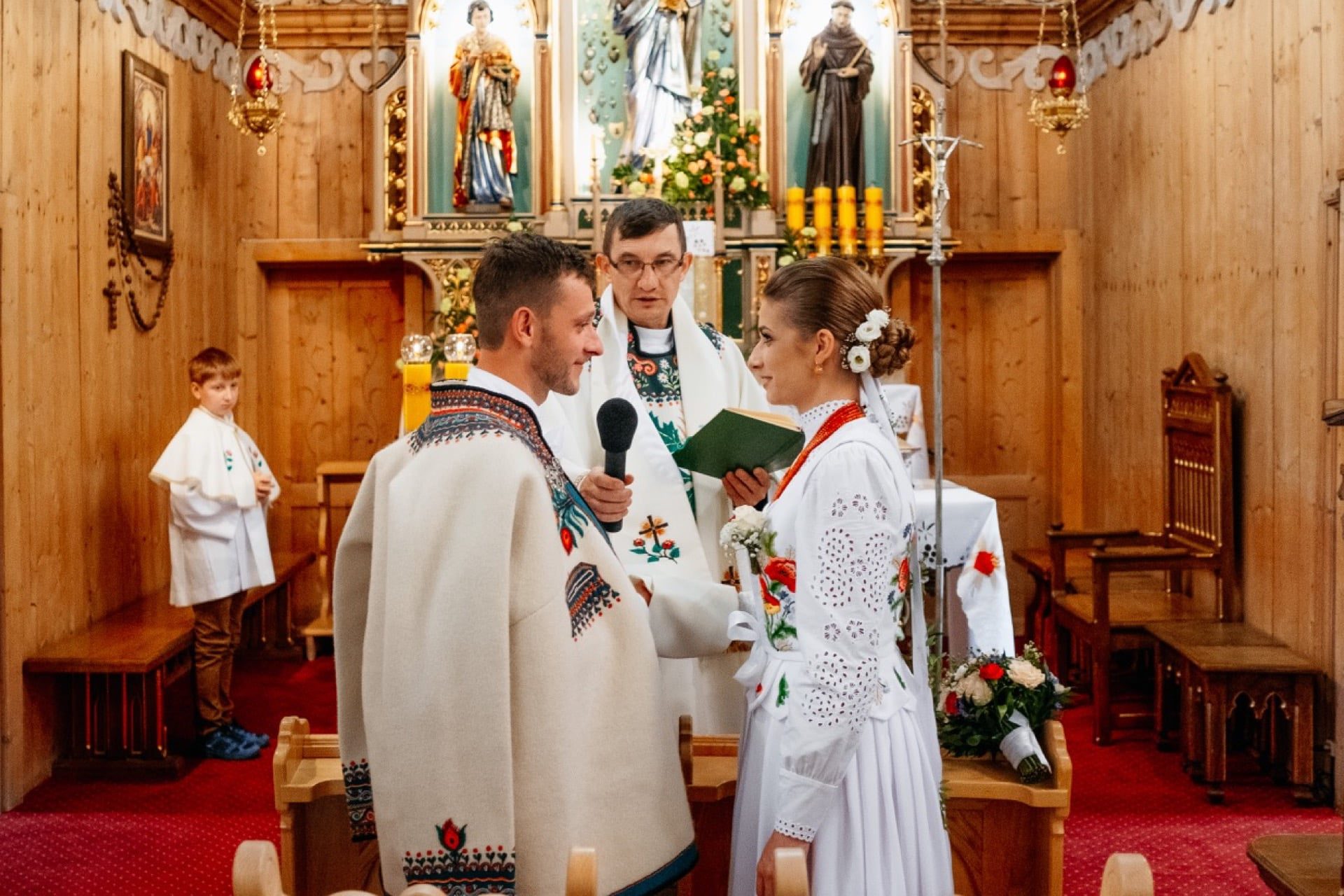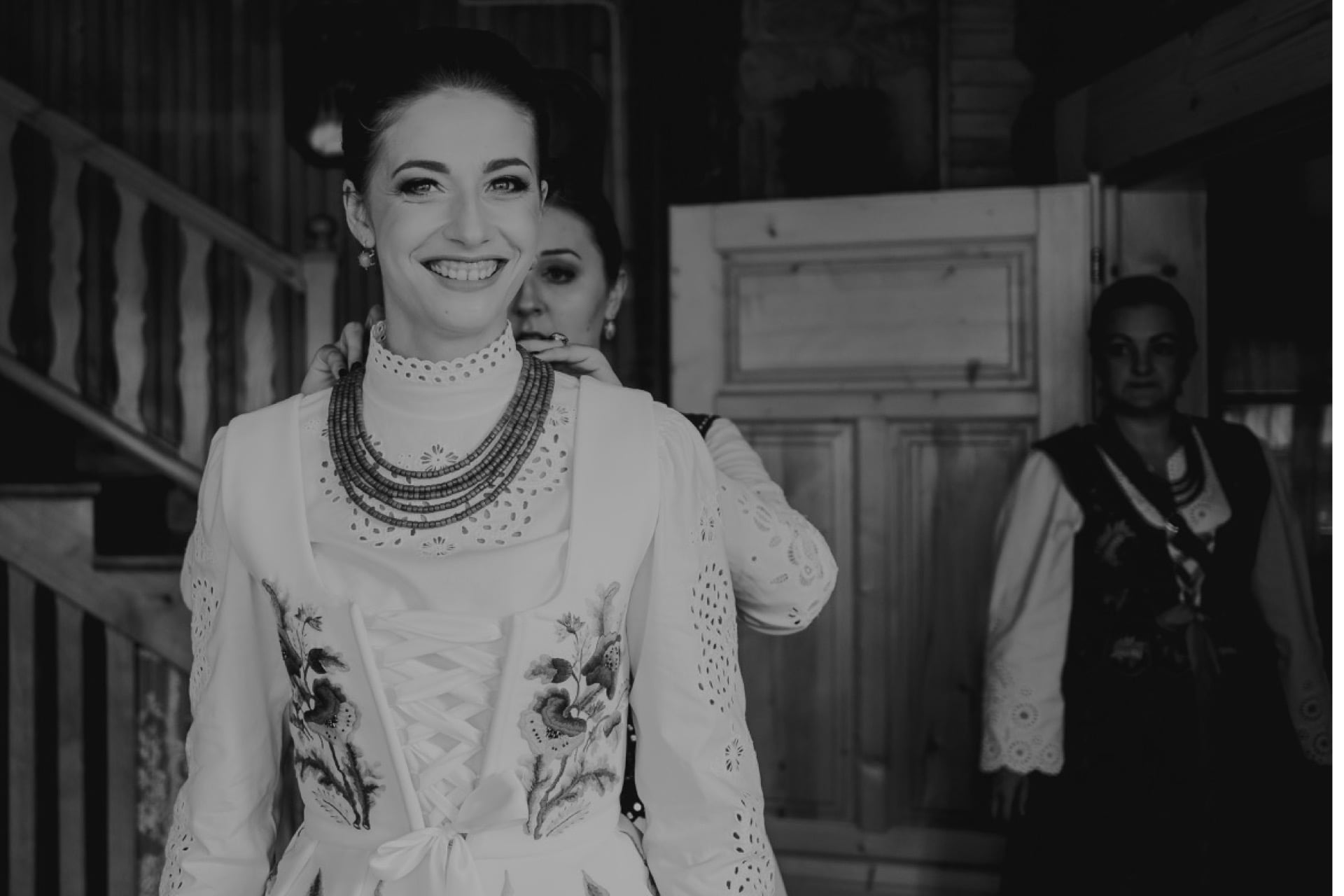 Suknia panny młodej składa się z kilku elementów. Są to między innymi koszula z haftem, aksamitna kamizelka i kilkuwarstwowa spódnica z koronkami, ale nie mniej istotne są same dodatki, czyli prawdziwe skórzane kierpce i czerwone korale. Co zakłada na siebie pan młody? Jest to również haftowana koszula oraz portki, czyli specjalne regionalne spodnie góralskie, a także bogato zdobiona peleryna. Nie pozostaje mi nic innego, jak życzyć im równie pięknego i kolorowego życia na nowej drodze.