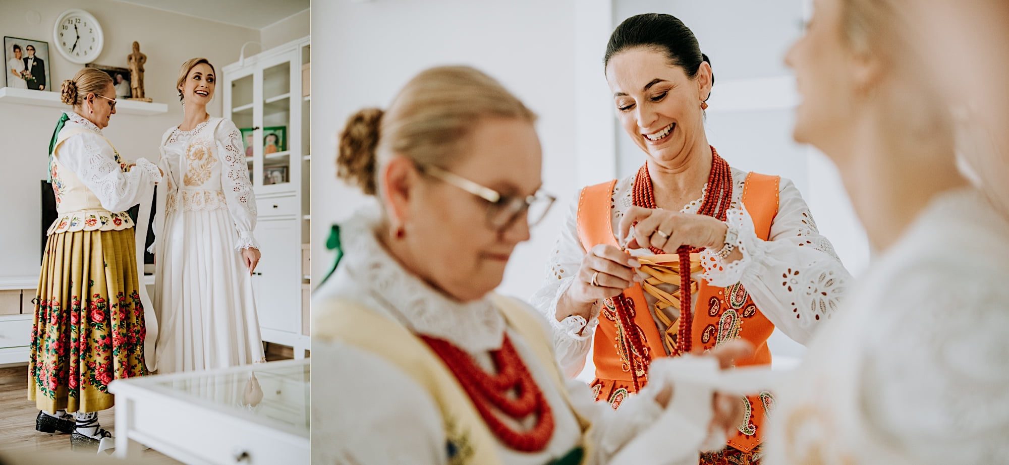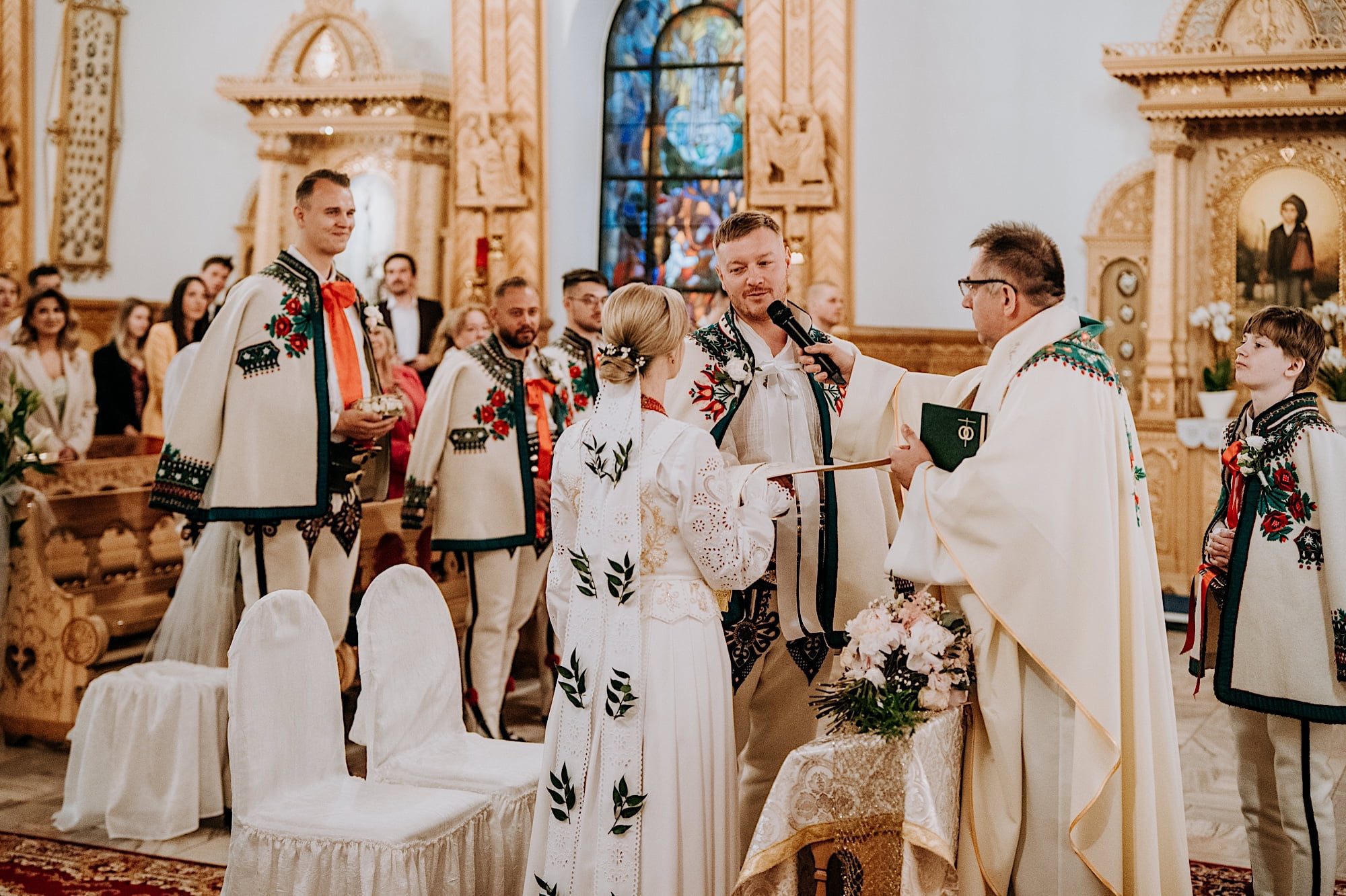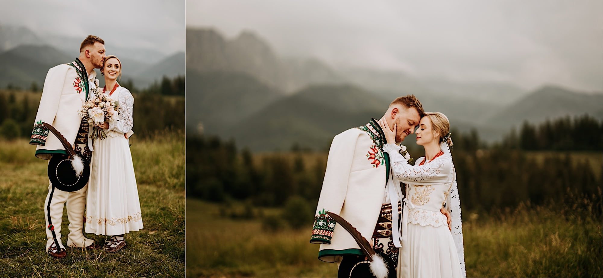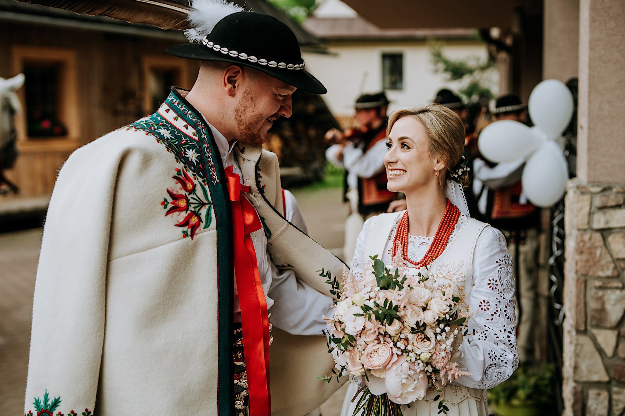 Suknia panny młodej składa się z kilku elementów. Są to między innymi koszula z haftem, aksamitna kamizelka i kilkuwarstwowa spódnica z koronkami, ale nie mniej istotne są same dodatki, czyli prawdziwe skórzane kierpce i czerwone korale. Co zakłada na siebie pan młody? Jest to również haftowana koszula oraz portki, czyli specjalne regionalne spodnie góralskie, a także bogato zdobiona peleryna. Nie pozostaje mi nic innego, jak życzyć im równie pięknego i kolorowego życia na nowej drodze.