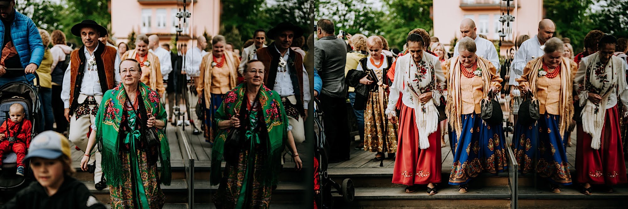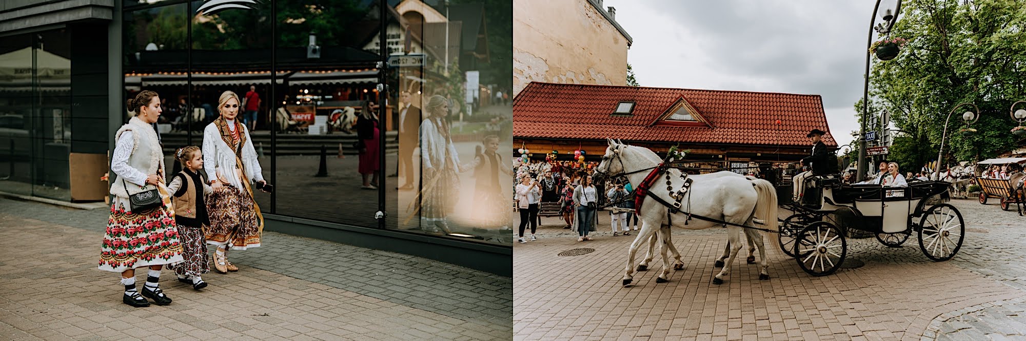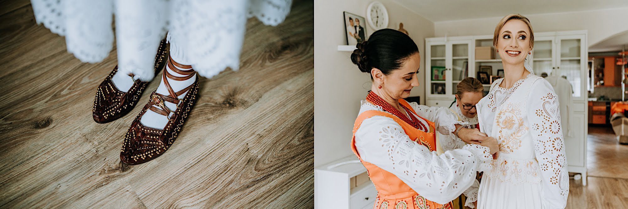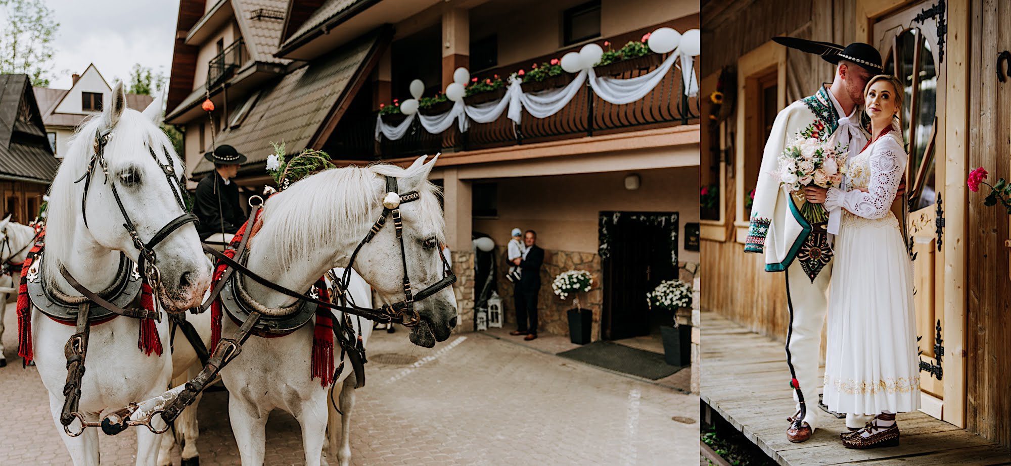 Suknia panny młodej składa się z kilku elementów. Są to między innymi koszula z haftem, aksamitna kamizelka i kilkuwarstwowa spódnica z koronkami, ale nie mniej istotne są same dodatki, czyli prawdziwe skórzane kierpce i czerwone korale. Co zakłada na siebie pan młody? Jest to również haftowana koszula oraz portki, czyli specjalne regionalne spodnie góralskie, a także bogato zdobiona peleryna. Nie pozostaje mi nic innego, jak życzyć im równie pięknego i kolorowego życia na nowej drodze.