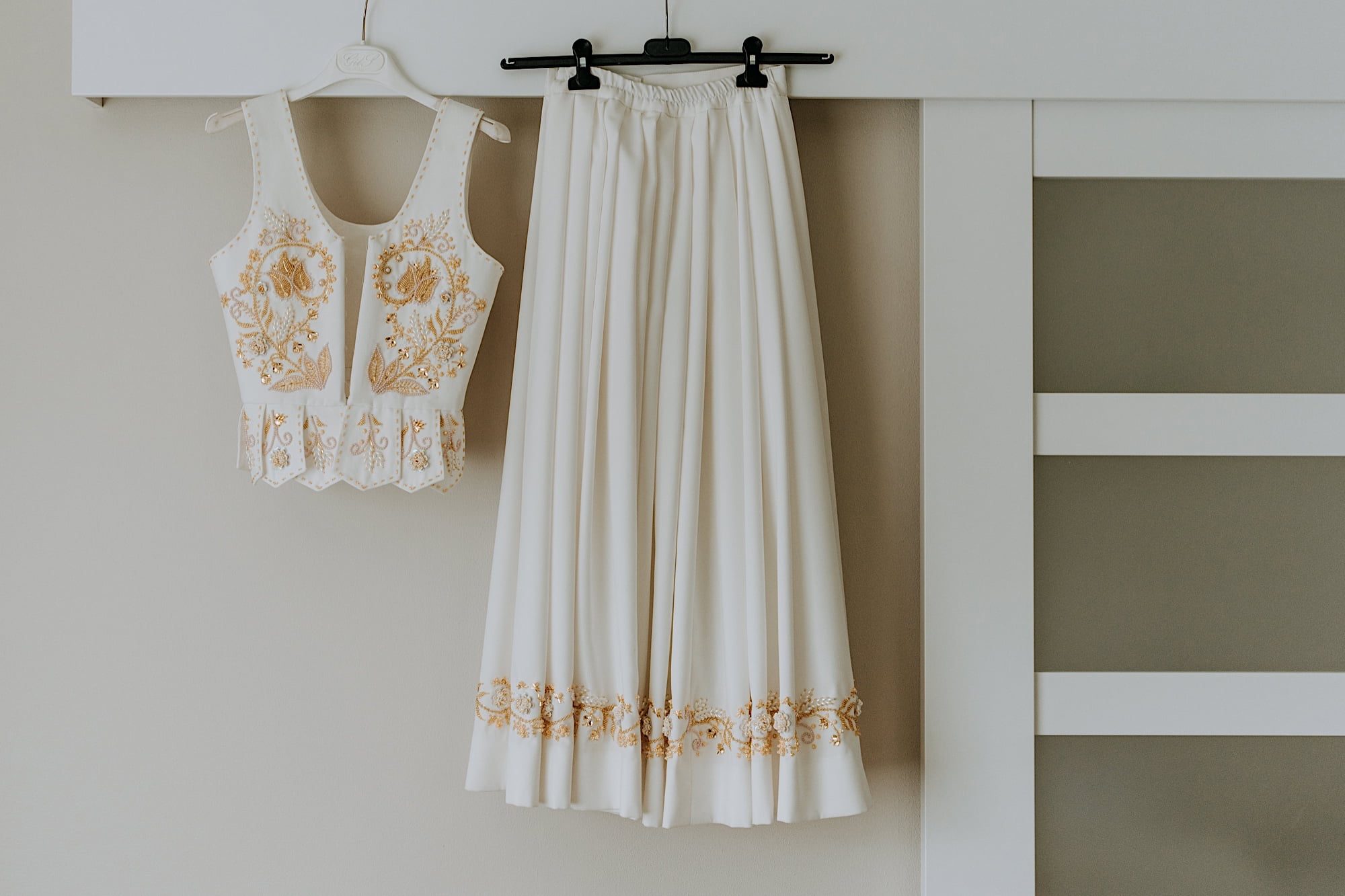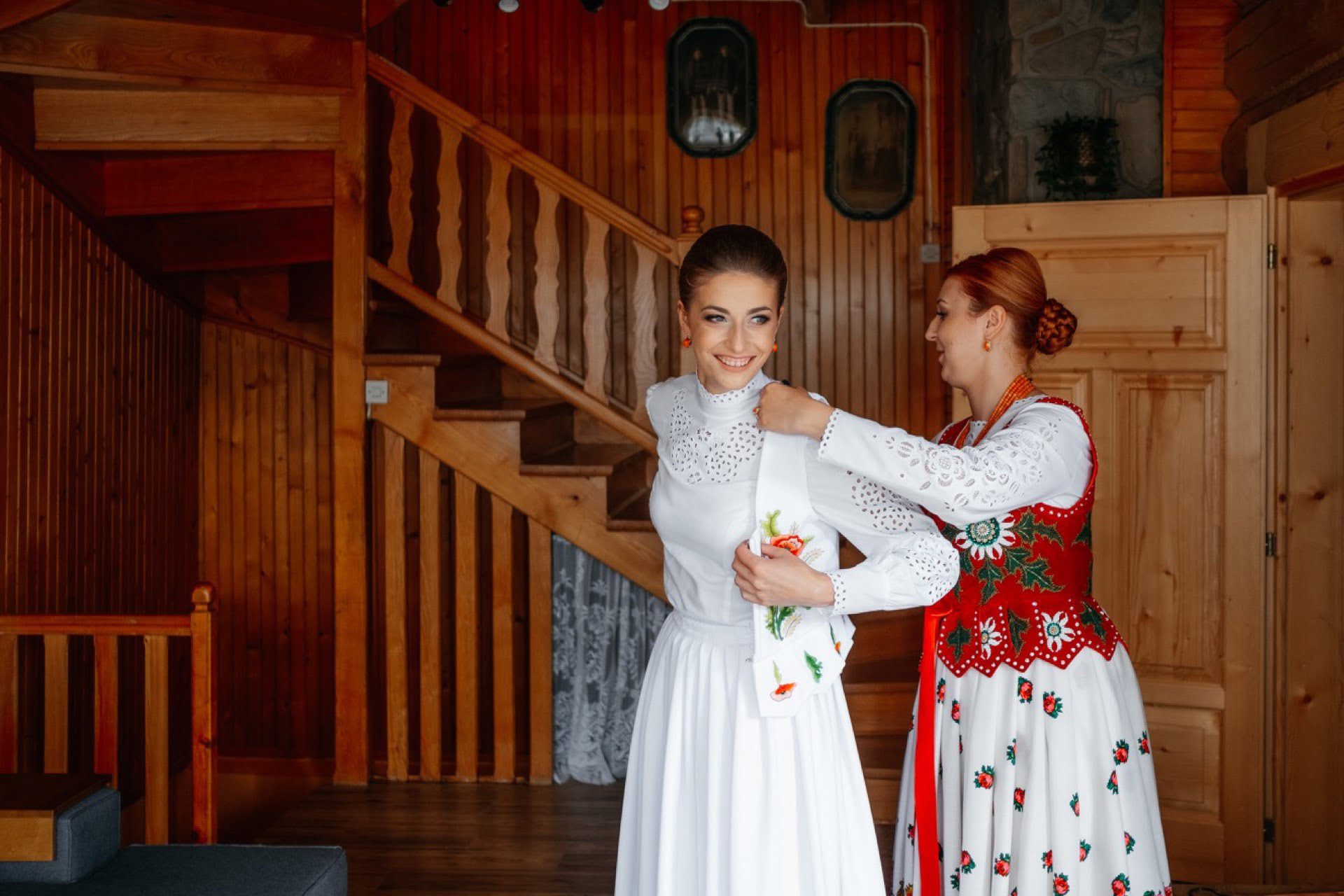 Według zwyczaju kreacja panny młodej składa się z kilku elementów: koszuli z haftem, aksamitnego gorsetu, długiej i najczęściej kilkuwarstwowej spódnicy wykończonej koronką. Cały zestaw zdobiony jest kolorowymi akcentami i motywem kwiatowym. Wśród dodatków uwagę zwraca wianek pleciony ze świeżych kwiatów, czerwone korale, a także kierpce i białe skarpety.