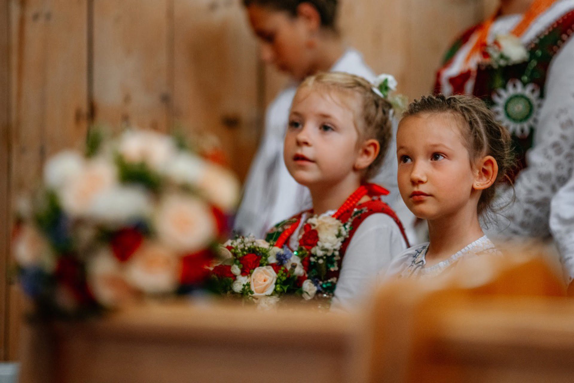 Przy organizacji góralskiego, folkowego wesela trzeba naprawdę zadbać o każdy najmniejszy szczegół. Ważna jest nawet fryzura panny młodej – włosy powinna mieć spięte w tradycyjnego koka. Wesele folk to zdecydowanie nie impreza dla fanów minimalizmu. Królują tu żywe barwy oraz wszechobecne kwiaty. Jeśli ktoś woli czerń i biel, może się nieco pogubić, ale za to nie można zaprzeczyć, że oprawa wesela folkowego jest niezwykle radosna. Na miejsce ceremonii para młoda wybrała urokliwy drewniany kościółek, który wyśmienicie pasował klimatem do charakteru uroczystości. Przyjęcie również odbyło się na sali pełnej drewna.
