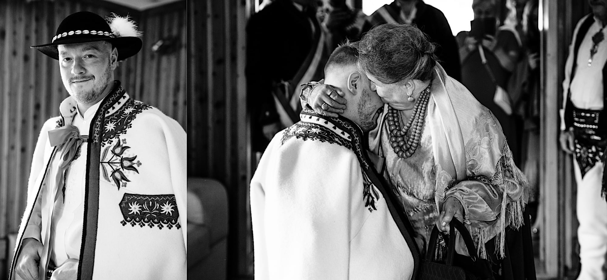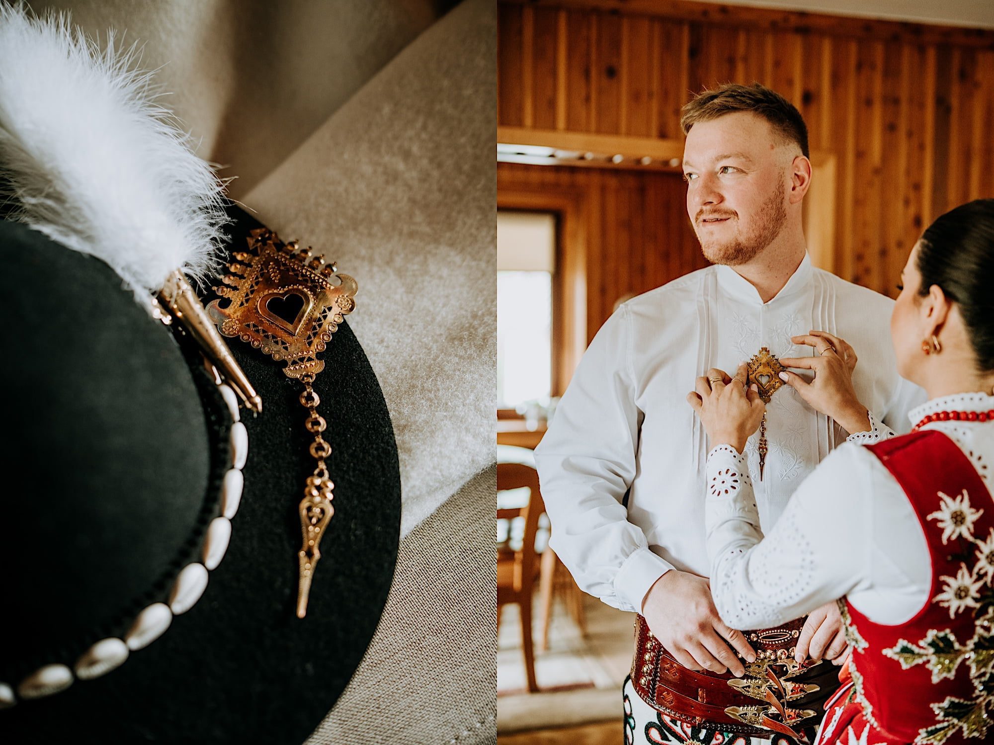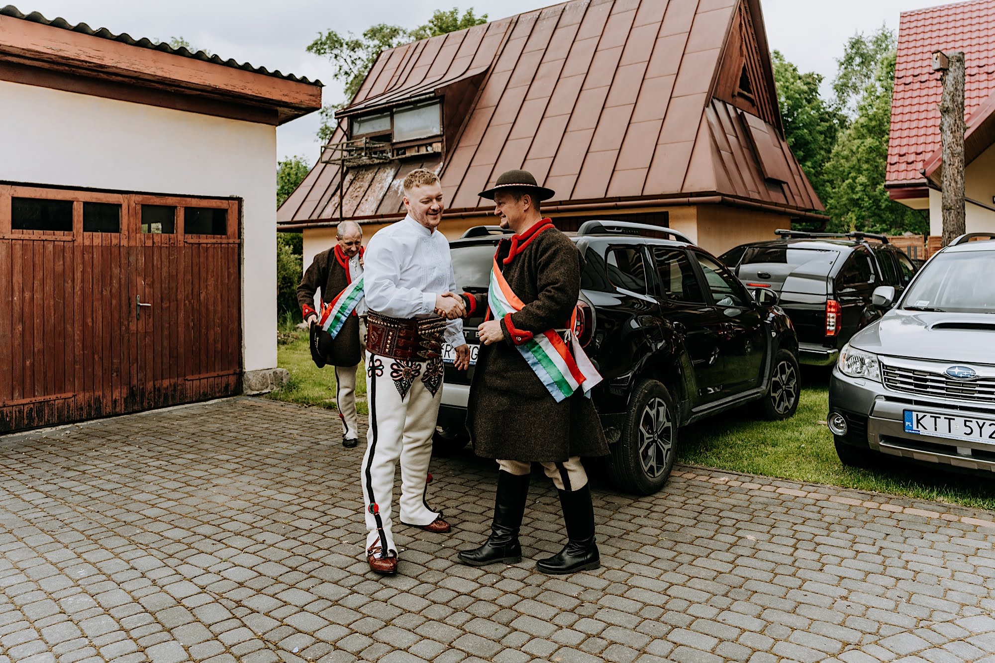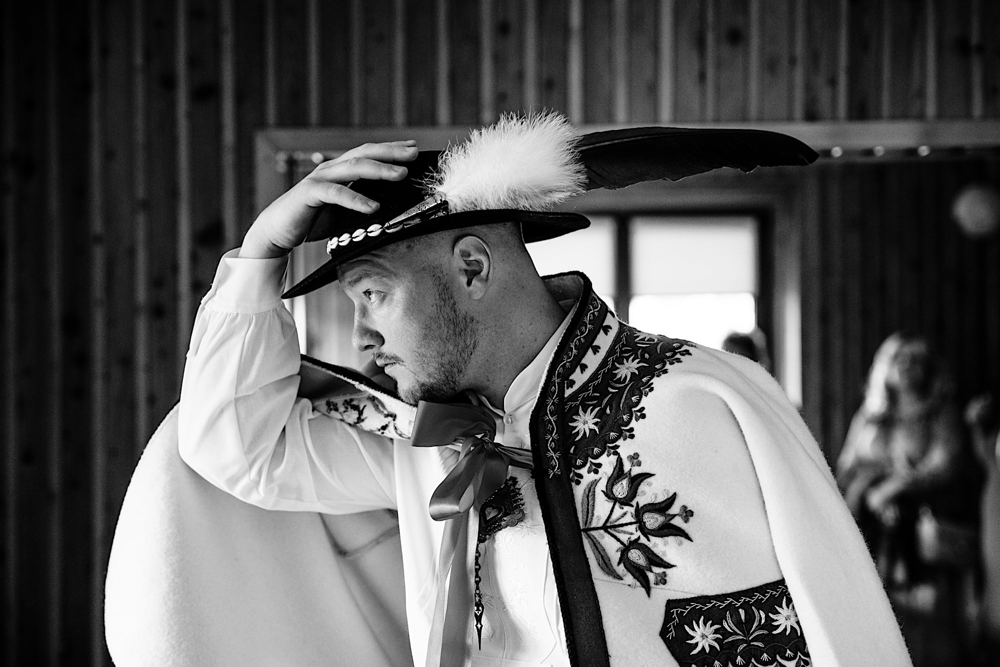 Z kolei na góralskie wesele w Zakopanem pan młody zakłada koszulę z haftem na mankietach i kołnierzyku, spodnie zwane „portkami” z rozcięciem przy kostce oraz cuchy, czyli bogato zdobiony płaszcz/pelerynę. Bardzo często towarzyszy mu też czarny kapelusz z filcu udekorowany długim piórem i szeroki skórzany pas. Podobnie jak u panny młodej, pan młody również nosi kierpce. Każdy z tych detali dokumentuję oczywiście na pamiątkowych zdjęciach ze ślubu.
