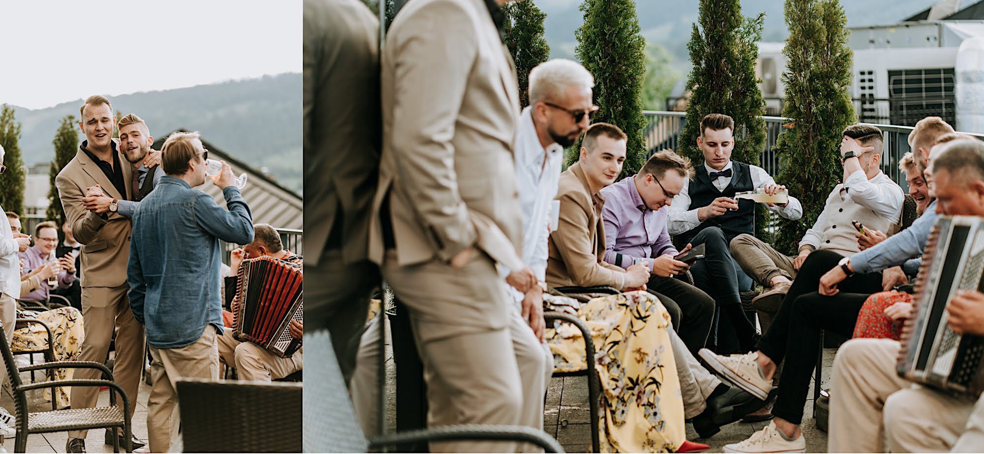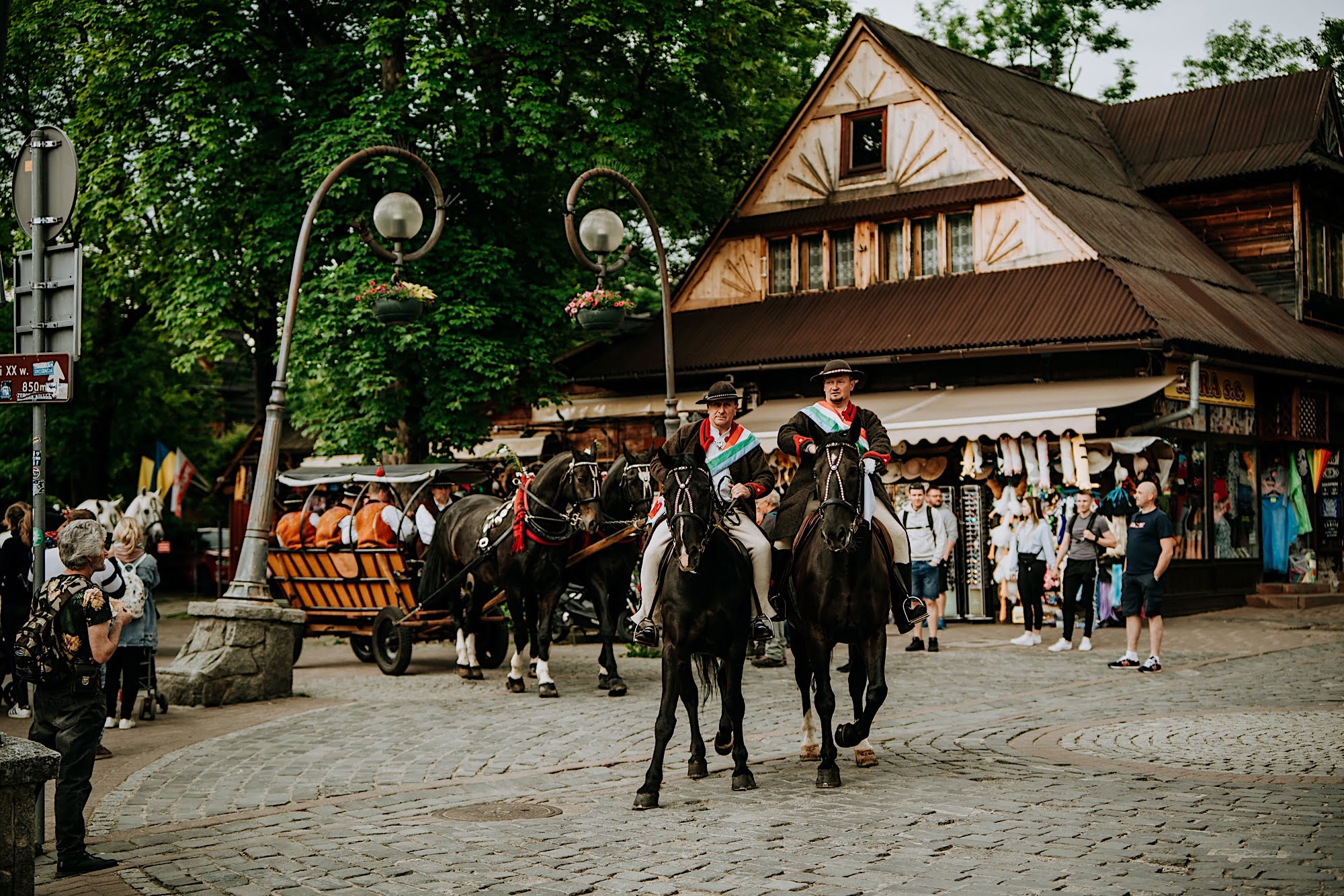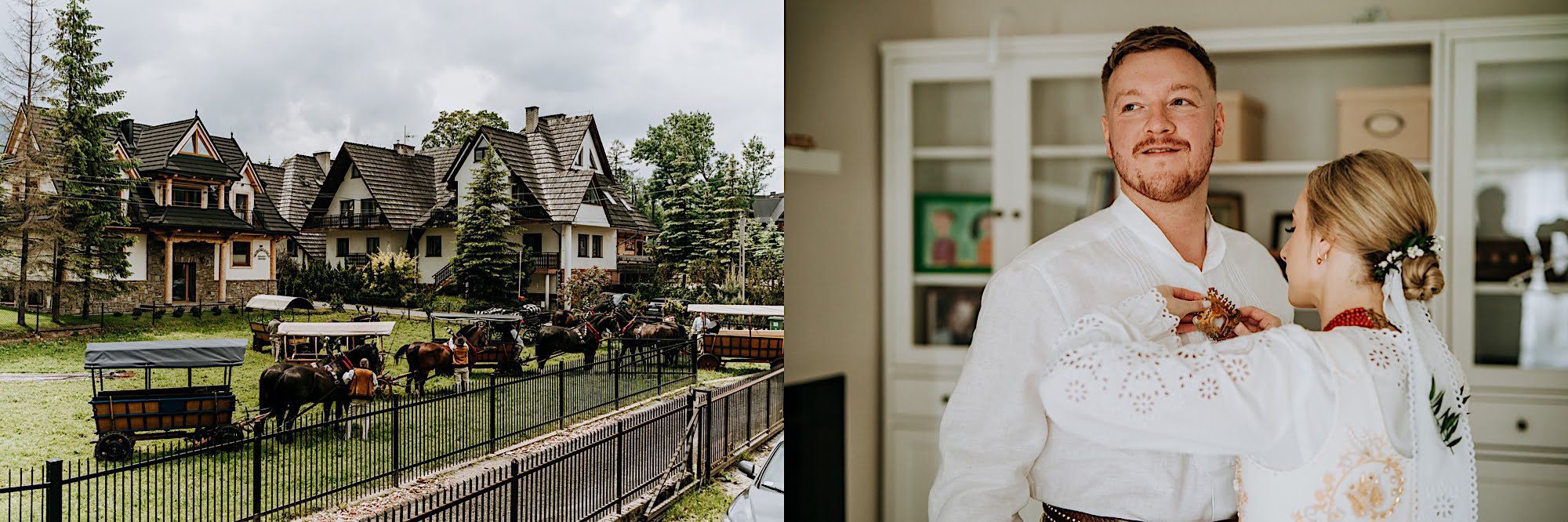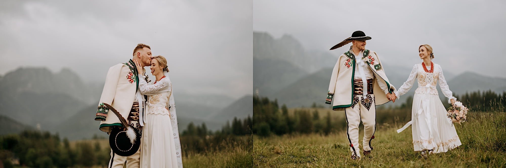 Z kolei na góralskie wesele w Zakopanem pan młody zakłada koszulę z haftem na mankietach i kołnierzyku, spodnie zwane „portkami” z rozcięciem przy kostce oraz cuchy, czyli bogato zdobiony płaszcz/pelerynę. Bardzo często towarzyszy mu też czarny kapelusz z filcu udekorowany długim piórem i szeroki skórzany pas. Podobnie jak u panny młodej, pan młody również nosi kierpce. Każdy z tych detali dokumentuję oczywiście na pamiątkowych zdjęciach ze ślubu.