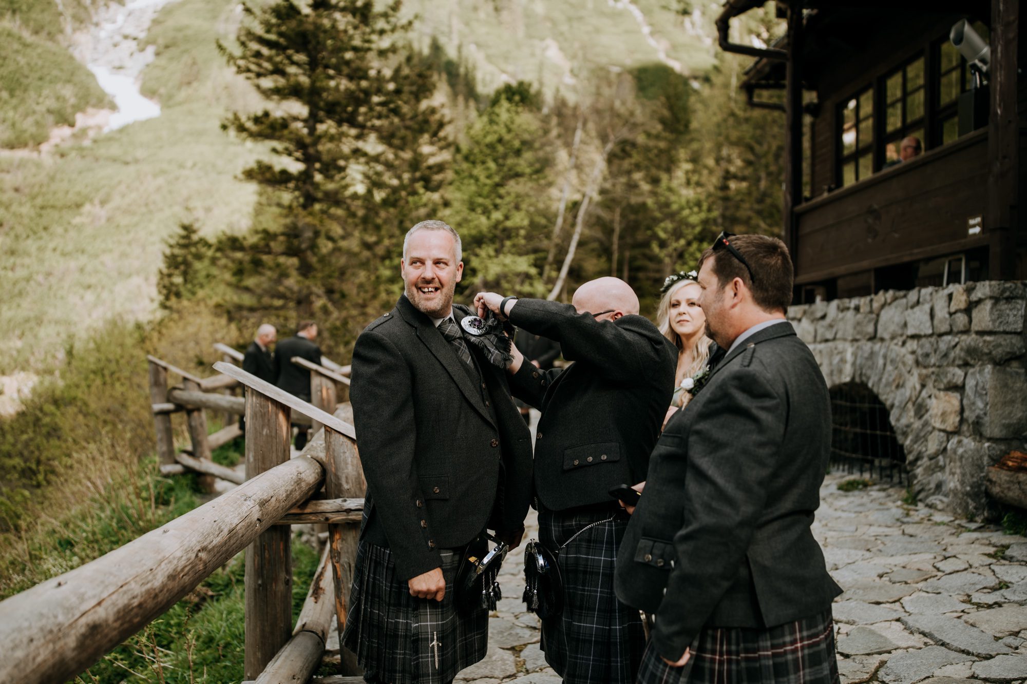 Ten **ślub nad Morskim Okiem** miał międzynarodowy charakter! Pan młody i goście wystąpili w **tradycyjnych szkockich kiltach**, a panna młoda – w eleganckiej sukni z welonem. Do ołtarza (czyli brzegu jeziora!) poprowadził ją syn, co dodało ceremonii wyjątkowego, rodzinnego ciepła.